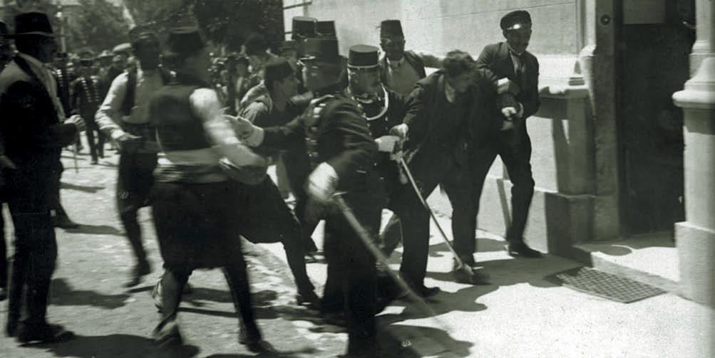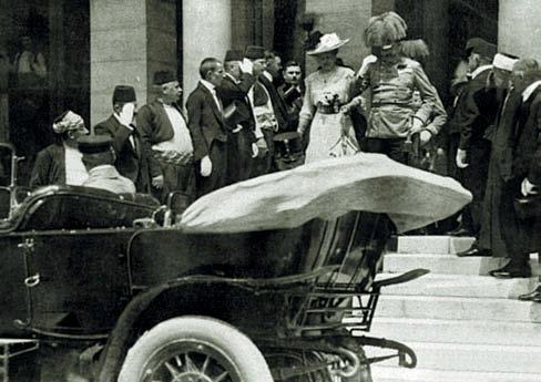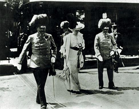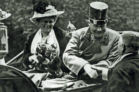 Эрцгерцог и его супруга. Скорее всего, это их последняя прижизненная фотография. Через несколько минут шофер эрцгерцога по ошибке свернет на узкую улицу Франца-Иосифа и, видя, что попал не туда, начнет разворачивать автомобиль, ставший идеальной мишенью; по странному совпадению там находился Гаврило Принцип, который немедленно выскочил на улицу, вытащил приготовленный револьвер и выстрелил дважды – в эрцгерцога и его жену. Обе раны оказались смертельными: София скончалась через несколько секунд, Франц-Фердинанд прожил 10 минут после ранения