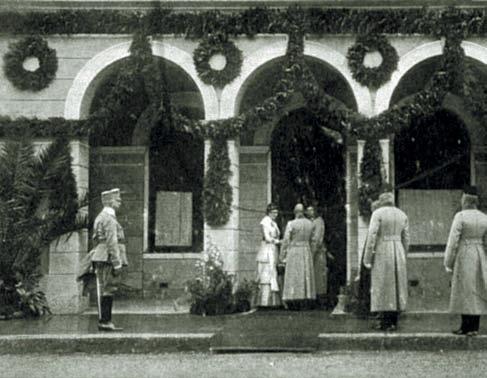 Франц-Фердинанд и графиня Хотек выходят из ратуши, направляясь к автомобилю
