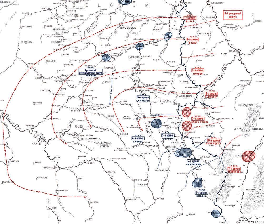 Примечание: в случае нарушения Германией бельгийского нейтралитета, 5-я французская армия смещалась севернее, а 4-я занимала позицию левее 3-й.