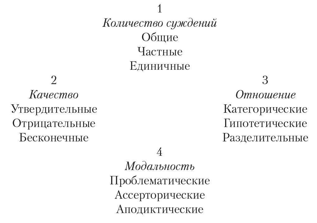 § 9. О логической функции рассудка в сужденияхЕсли мы отвлечемся от всякого содержания суждений вообще и обратим внимание на одну лишь рассудочную форму суждений, то мы найдем, что функции мышления в них можно разделить на четыре группы, из которых каждая содержит три момента. Их можно хорошо представить в следующей таблице: