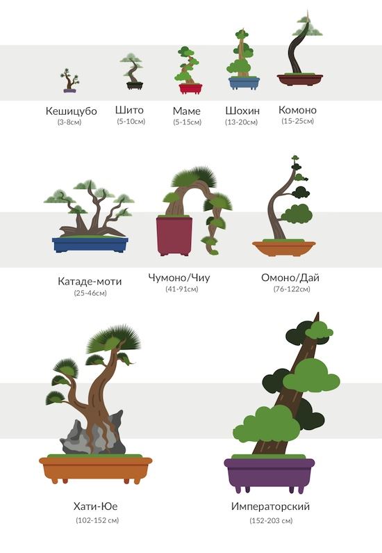 Классификации бонсай по размеруСуществует несколько классификаций бонсай по размеру. В стародавние времена для этого использовалось число: количество людей, требуемое для поднятия конкретного дерева.