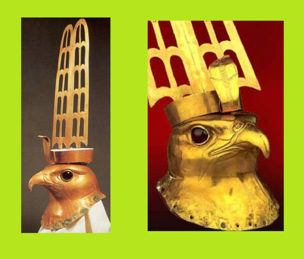 В одном из храмов был обнаружен еще один шедевр мелкой пластики – золотая голова сокола Гора с черными, инкрустированными обсидианом глазами. Голову птицы венчает сквозная золотая корона. Декоративный эффект достигается гармонией цвета и формы, металла и камня. В этой небольшой по размеру работе как в капле воды сконцентрирован невероятный уровень возможностей мастеров Древнего царства.