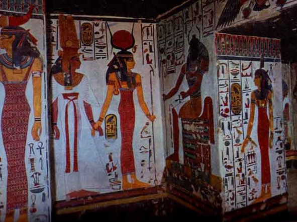 В областях (номах)Среднего Египта, расположенных к северу от Фив, сохранились великолепные памятники стенописи .Многоярусные композиции строились по регистрам, внутри которых художник пластично размещал фигуры людей, животных и птиц. Мастера делали эскизы и при помощи сетки квадратов переносили на стенку в соответствии с заданным масштабом. Если в Древнем царстве росписи играли подчиненную по отношению к рельефу роль, то в Среднем царстве они приобретают самостоятельное значение. Расширяется красочная палитра художника, появляется мягкая и тонкая прорисовка, что ведет к развитию живописных приемов. Посмотрите на все разнообразие животного и растительного мира Древнего Египта, навсегда запечатленного в своей цветовой и пластической красоте на стенах скальных гробниц. [8], [35] скальных гробниц