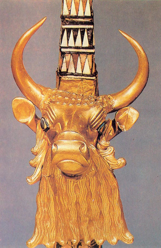 Голова быка. Навершие резонатора арфы. Из царской гробницы в Уре. Ок. 2600 до н. э. Источник – Википедия.