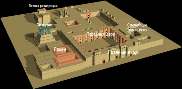 От ворот начинается основная улица города – «дорога процессий» богини , проходящая через весь город, выложенная красным и белым камнемСохранилась надпись на плите, обращение Навуходоносора к верховному богу Мардуку «Я, Навуходоносор, шаррум Вавилона. Я выложил вавилонскую дорогу для процессий… Мардук, владыка! Одари вечной жизнью!» На одном конце города находился огромный царский дворец, а на другом – главное святилище вавилонян – , важнейшим элементом которого являлась храмовая башня – семиэтажный (ступенчатая пирамида) высотой 91 метр, который назывался (храм краеугольного камня небес и земли). Каждый следующий этаж был меньше предыдущего и окрашен в другой цвет. (Сохранилось имя строителя – им был зодчий ). Нижняя ступень – черная, следующая – белая, дальше – фиолетовая, синяя, красная, серебряная. И самая верхняя – золотая. Зиккурат, названный в Библии ,считался в древности одним из чудес света. На вершине башни, куда вела наружная лестница, располагалось святилище верховного бога Мардука, где среди мраморных с золотом и лазурным камнем стен находились золотой стол, ложе бога, а также его почти шестиметровая золотая статуя в длинном, осыпанном звездами одеянии. На голове его светилась золотая тиара. Отсвет покрытого чистым золотом потолка озарял Мардука, словно сияние солнца. Внимание привлекали несоразмерно большие уши. Как известно, по представлениям древних вавилонян, – не мозг, а уши являлись вместилищем разума и духа. Раз в год, в праздник нового лунного года, шаррум покидал свой дворец на золотых носилках с пологом. Затем его можно было увидеть лежащего распростертым перед золотым истуканом, как бы принесенного в жертву Мардуку, а жрецы совершали обряд «воскресения» на новый годичный срок. Судьба стояла над людьми и богами, будущее читали по звездам в священной роще. Семь ярусов Этеменанки символизируют семь главных богов, семь планет, семь дней недели. [14] Иштар . Эсагила зиккурат Этеменанки Арадаххешу «Вавилонской башней»