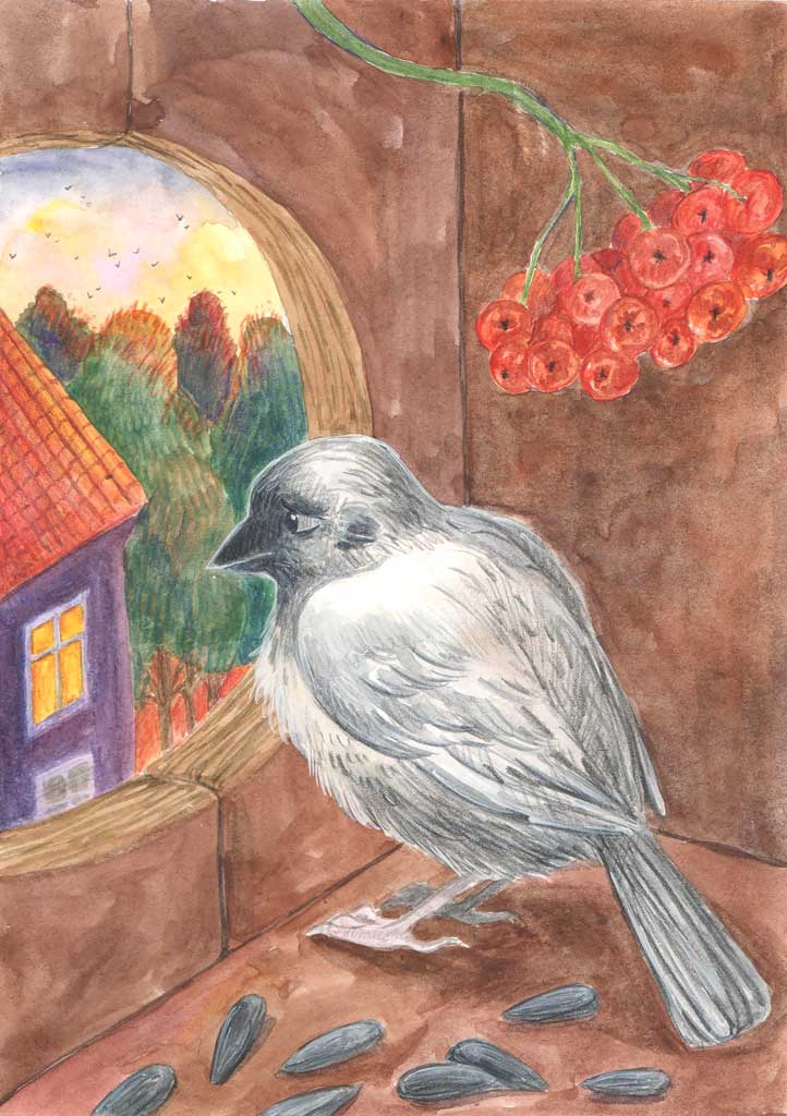 Прошло лето, осень, подступала зима. На дворе стоял лёгкий морозец. Дети кое-где уже успели повесить для птиц кормушки с едой. Воробьи, весело чирикая, перелетали с ветки на ветку. Только белый воробушек грустил. Так устал он быть воробьём, что у него не было больше сил. Он сиротливо сидел на ветке, скучая по маме, папе, по людям… В этот самый момент прилетел старый воробьиный вождь.