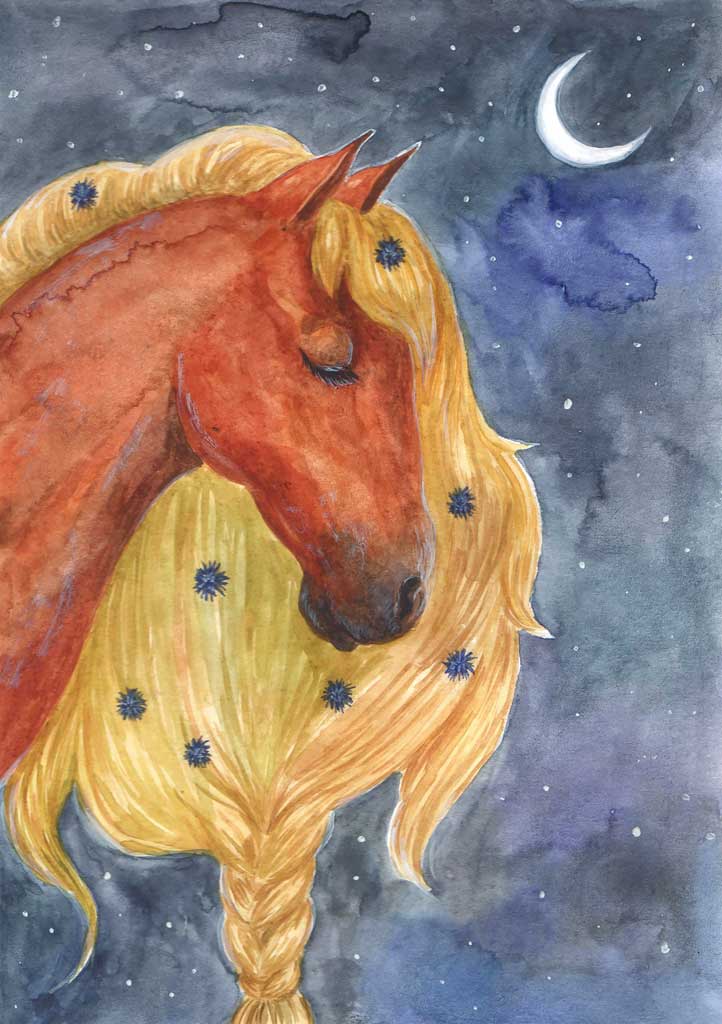 О, как давно это было! Жил в селе один подпасок. Ходил в ночное, пас стада и очень хорошо играл на дудочке. И однажды трелью своей приманил коня златогривого. Конь прилетел к нему на лёгком алом облаке. Сам конь был рыже-красным, по бокам у него было по одному большому сизо-белому крылу, грива золотая, в тугую косу, наполовину хвост сплетён шёлковой голубой тесьмою, шерсть лоснится, широка и высока грудь и круп величины большой, округлой формы. Играют мышцы в лучистом переливе, горят в весёлом нраве глаза, во лбу звезда… Ну, всё при нём, глаз не оторвать! Паренёк воскликнул: