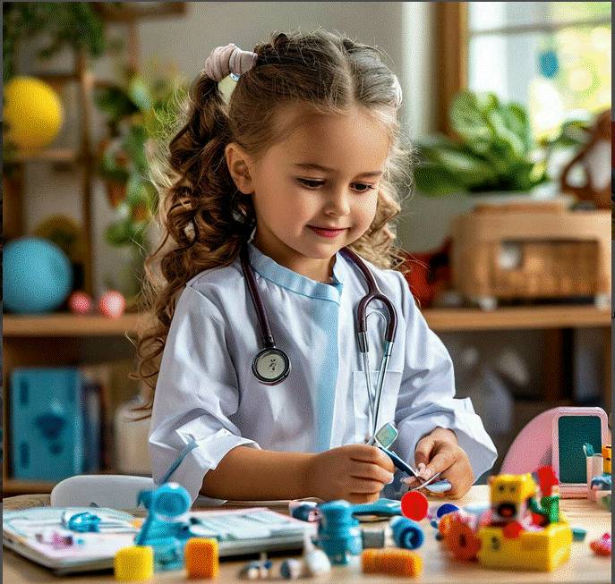 Вот и сегодня утром Маринка надела свой любимый белый халатик, усадила игрушки, образуя длинную очередь, проверила наличие медицинских инструментов и карточек пациентов, приготовившись начать прием.