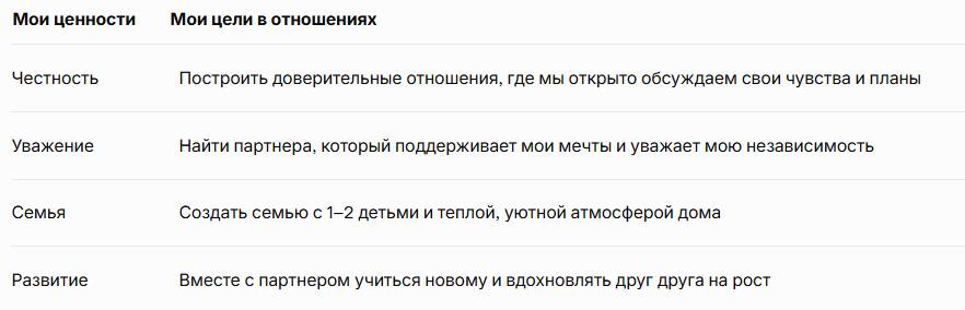 Чтобы закрепить свои размышления, выполните следующее упражнение. Возьмите лист бумаги или откройте заметки в телефоне и разделите страницу на две колонки: «Мои ценности» и «Мои цели в отношениях». В первой колонке запишите 3–5 ключевых ценностей, которые вы определили. Во второй – сформулируйте 2–3 цели, которых вы хотите достичь через отношения. Вот пример:
