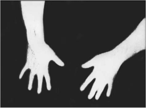 2-я степень (выраженная) – значительное ограничение объема движений (амплитуда движений в плечевых и тазобедренных суставах не превышает 50°; в локтевых, коленных, голеностопных объем движений уменьшен до 20 – 45°; подвывихи суставов с выраженной девиацией кисти, стопы за счет периартикулярных, рубцовых изменений, а также атрофии мышц; выраженное нарушение функции схвата, удержания предметов; существенное расстройство опорной функции стопы, значительная одеревенелость, скованность в течение всего дня);