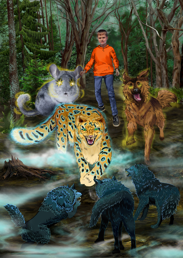 Вдруг Грэй, к изумлению Кирилла, сильно увеличился в размерах, он стал раз в пять больше, и глаза его засветились, как яркие лампочки. С Барсиком тоже произошло что-то невообразимое – он превратился в настоящего барса, и глаза его так же засветились, как у Грэя. У огромной шиншиллы тоже из глаз исходили яркие лучи света в сторону волков. Волки замедлили ход, но продолжали приближаться, злобно рыча и скаля зубы. Грэй и Барс зарычали в ответ и ринулись в бой. А шиншилла осталась с иcпуганным мальчиком, наверное, для того, чтобы ему не было так страшно.