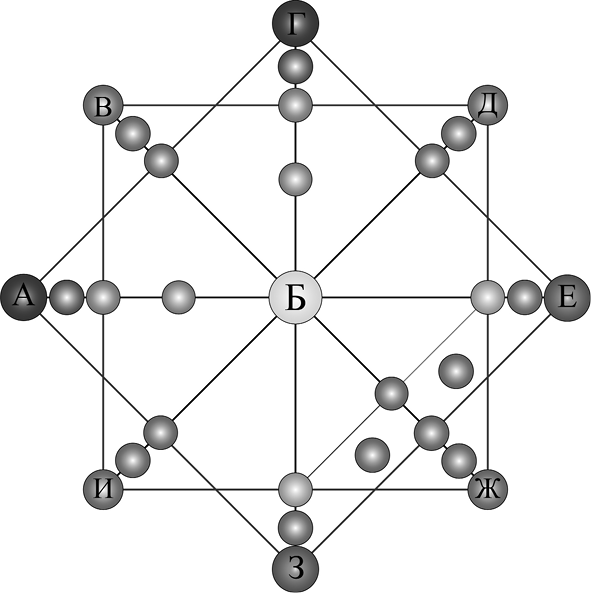 Помимо того, в сетке вы увидите и диагональные линии, пересекающиеся в центре – все в той же зоне комфорта. Диагонали олицетворяют родовую карму. Линия, идущая из точки В в точку Ж, – «мужская» сторона вашего рода. Диагональ от точки Д до И – «женская» часть вашего рода. Обе диагонали – кармический багаж, который выдали вам мужчины и женщины вашего рода прежде, чем вы воплотились в этой жизни.