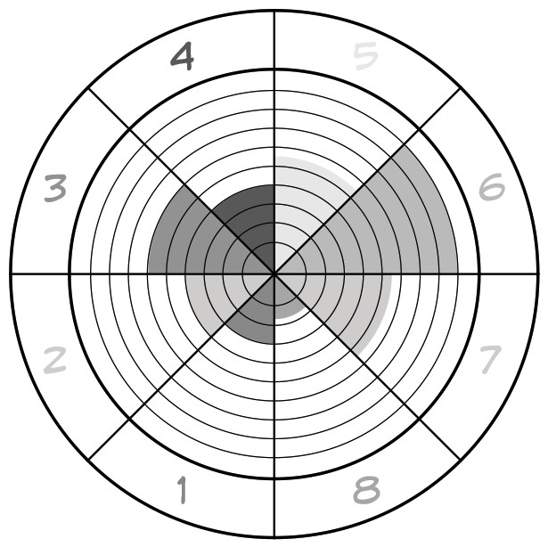 Закрасьте итоговую сумму баллов по секторам (пример см. на рис. 2).