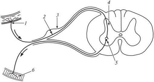 1 – чувствительные рецепторы в коже; 2 – чувствительный (афферентный) нейрон; 3 – спинномозговой ганглий; 4 – серое вещество спинного мозга; 5 – двигательный (эфферентный) нейрон; 6 – окончание двигательного волокна в мышце