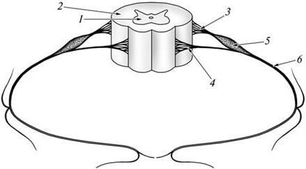 1 – серое вещество; 2 – белое вещество; 3 – задний корешок; 4 – передний корешок; 5 – спинномозговой ганглий; 6 – спинномозговой нерв