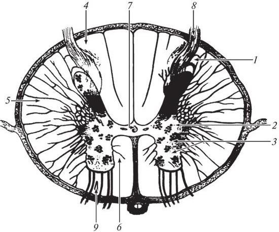 1 – задний рог; 2 – боковой рог; 3 – передний рог; 4 – задний канатик; 5 – боковой канатик; 6 – передний канатик; 7 – центральный канал; 8 – задний корешок; 9 – передний корешок