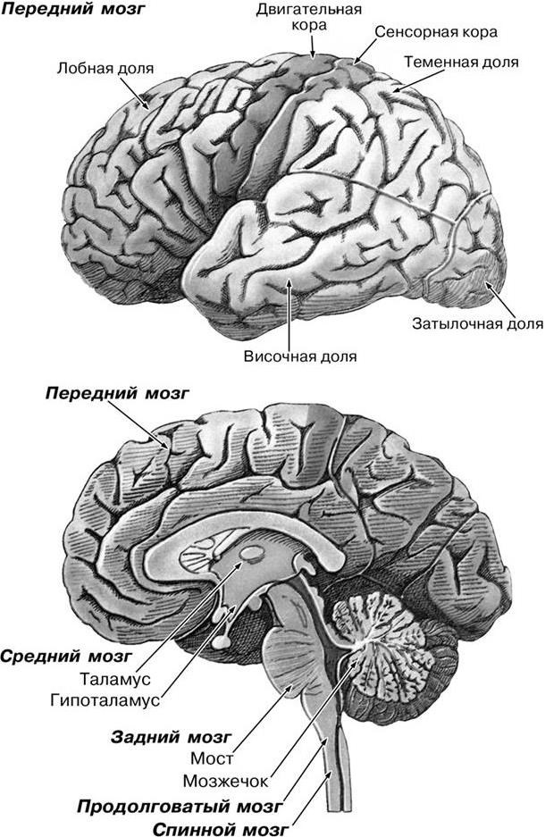 Поверхностный слой полушарий — кора, которая вместе с несколькими структурами, лежащими в глубине, составляет передний мозг. Также имеется промежуточный, средний, задний (мост и мозжечок) и продолговатый мозг (рис. 9).