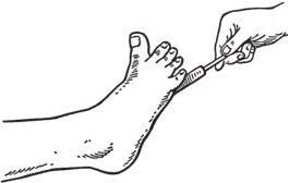 Рефлекс Оппенгейма вызывается проведением по передней поверхности большеберцовой кости сверху вниз большим пальцем или средней фалангой II пальца. Ответная реакция такая же, как при определении рефлекса Бабинского, т. е. разгибание большого пальца. Рефлекс Гордона проявляется также разгибанием большого пальца стопы при сжатии икроножной мышцы.