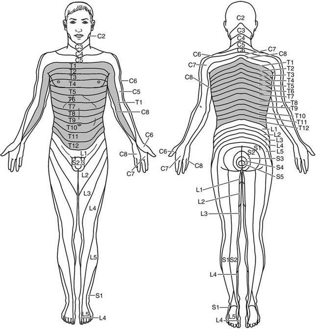 Рис. 14. Зоны сегментарной чувствительной иннервации кожи (вид спереди и сзади):