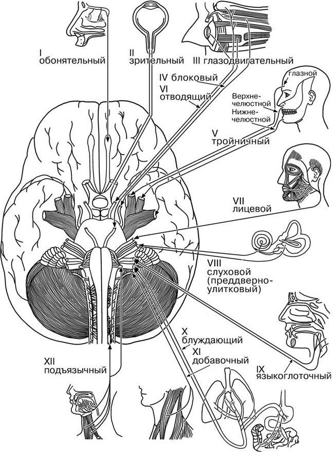Из них три пары чувствительные (I, II, VIII), шесть пар двигательные (III, IV, VI, VII, XI, XII) и три пары смешанные (V, IX, X). Все эти нервы иннервируют мышцы лица, гортани, глотки, языка и частично шеи, а блуждающий нерв – мышцы внутренних органов.
