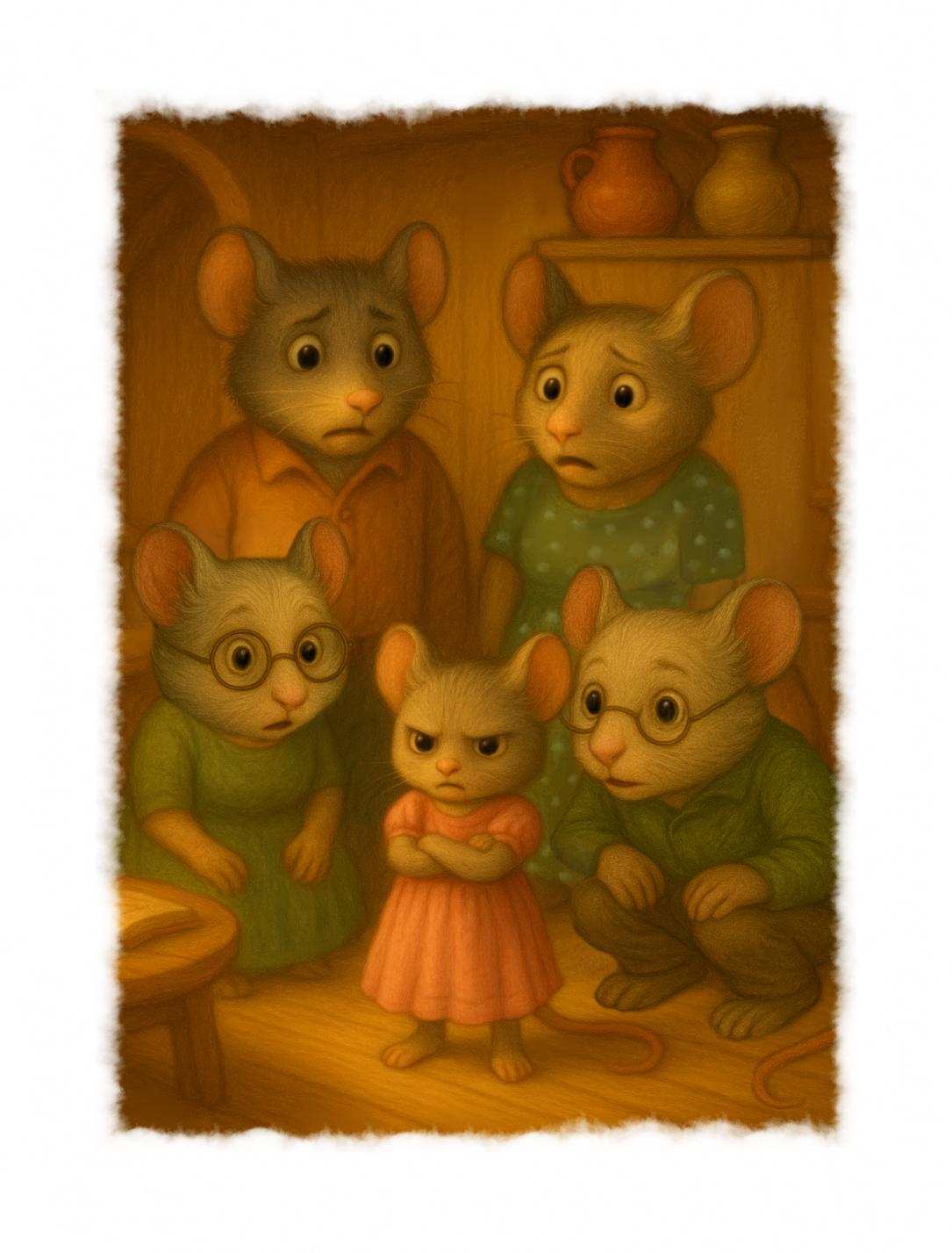 Жила на далекой поляне сказочного леса маленькая мышка. Была у нее самая обычная, ничем не отличающаяся от других семья: папа, мама, бабушка и дедушка. Ничего такого волшебного в них не было. Маленькое семейство серых полевых мышей, живущих в достатке, но без признаков королевской роскоши. И все с виду у них все нормально, тихо да спокойно, и не отличаются они от других жителей на поле, но была у этого семейства одна большая проблема, которую видели все, кроме них. Это их невоспитанная дочь.