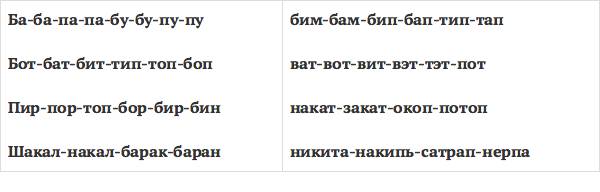 Добейтесь безупречного (не надо слишком быстрого) чтения всего этого списка и продемонстрируйте его вашему речевику-имиджмейкеру на занятиях. Засеките время безупречного чтения списка и постепенно, раз за разом, старайтесь его сокращать. Сравните первоначальные результаты с окончательными.
