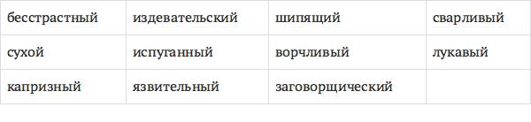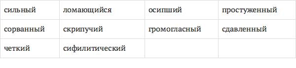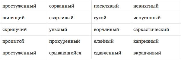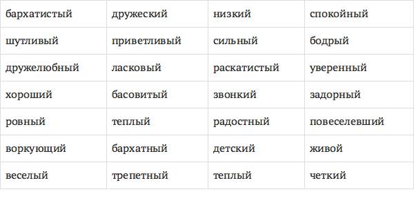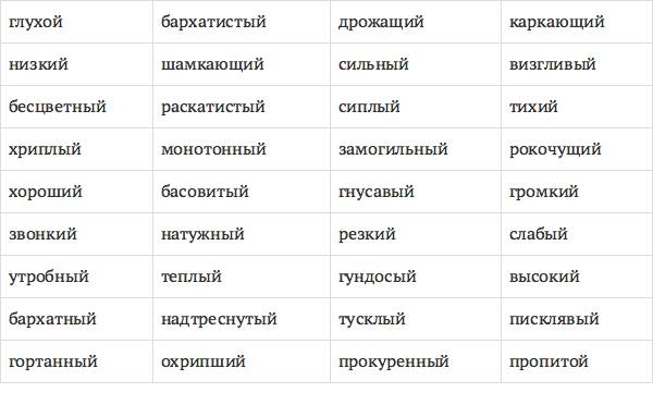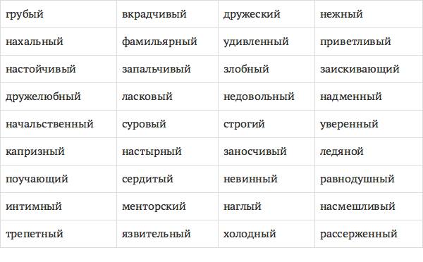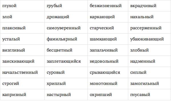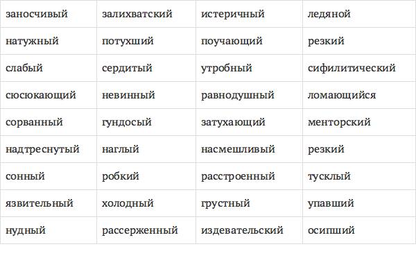 насмешливый, заискивающий, ломающийся, сонный, визгливый, строгий, истеричный, тусклый, наглый, язвительный, сифилитический, дружелюбный, детский.