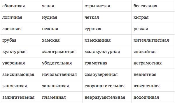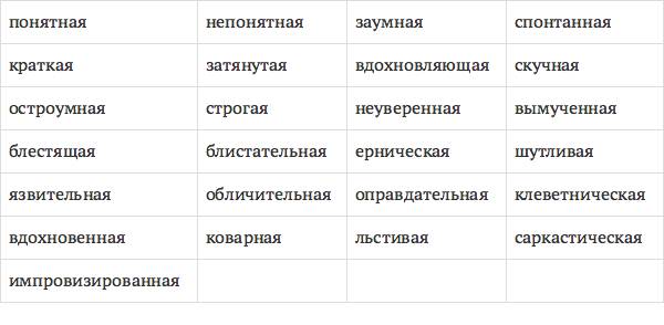 Задание 1. Сразу, без подготовки, прямо в классе напишите на листке бумаги все определения к речи, какие вы сможете вспомнить. Сравните их с нижеприведенным списком (пусть вас не смущает, что некоторые определения могут подойти как для характеристики голоса и тона, так и для характеристики речи).