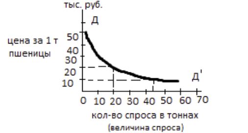 Рис. 1 представляет иллюстрацию к одной из экономических задач, по построению графика кривой спроса ДД,. Здесь мы видим следующую закономерность. При цене 50 тыс. руб. за 1 т. пшеницы – не будет куплено ни одного кг. Зато при цене 10 тыс. руб. – купят 45 т. На рис. 2 пунктирной линией Д1Д1, показан рост спроса – смещением кривой вверх направо. Уменьшение спроса – пунктирной линией Д2Д2, вниз налево. Кривую спроса принято обозначать линией ДД.