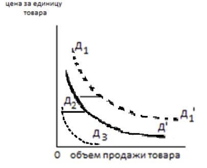 Спрос изображается в виде графика, показывающего количество продукта, которое потребители готов купить по некоторой цене из возможных цен в течение определенного времени. (См. рис. 1). Это находит отражение в нисходящем направлении кривой спроса вправо (увеличение спроса), а влево – сокращение спроса. Спрос – непостоянная категория. Спрос меняется под воздействием неценовых факторов, что отражается в перемещении и изменении конфигурации наклона кривой спроса, выражая изменение количества проданных товаров.