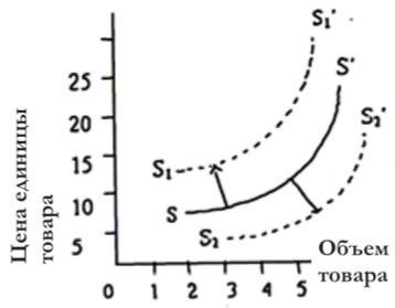 Кривую предложения принято обозначать линией SS,. Понятие – «изменение кривой предложения» – обозначает смещение всей кривой вправо или влево, с допущением – «при прочих равных условиях». Т.о., SS, – кривая предложения при неизменной цене. При снижении предложения кривая смещается влево – от SS,к S1S1,. При росте предложения – кривая смещается вправо от SS, к S2S2, (см. рис. 4).
