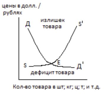Точка пересечения Е нисходящей кривой спроса ДД, и восходящей кривой предложения SS, показывает равновесную цену и количество продаваемого продукта.