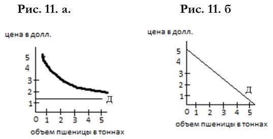 Пусть наш частный предприниматель – фермер. Хотя объем продажи пшеницы постоянно возрастает 1, 2,3,4, 5 тонн, кривая спроса для фермера постоянно равна одной и той же величине (рис. 11. а). Далее, пусть цена за 1 тонну пшеницы будет уменьшаться, падать. Тогда график кривой спроса Д (рис. 11. б) будет иметь наклон вниз вправо, т.к. больше пшеницы потребители купят по более низкой цене. Отсюда ясна нижняя граница той цены, которую фирма запрашивает за свои товары на рынке. Этой границей являются средние издержки на производство единицы товара. Они определятся как частное от деления общей суммы затрат фирмы на число произведенных ею товаров. Если эта разница положительна, то фирма получит прибыль и может успешно развиваться. Если эта разница отрицательна, фирма несет убытки, что в итоге может привести к банкротству и ликвидации.