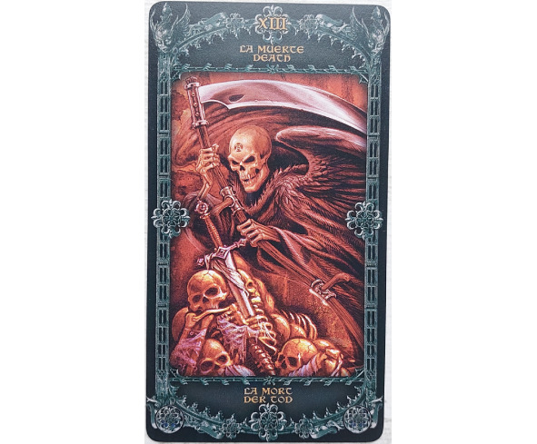 В «алхимической» колоде, как и в любой другой колоде Таро, Смерть также не означает смерть в физическом смысле: все колоды Таро создаются живыми людьми для живых. Сюжет карты удивляет своей динамичностью: здесь ангел Смерти выступает в роли защитника костей мертвецов, в которые неизвестный наглец вонзил меч.26