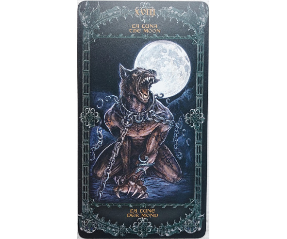 Вот теперь мы можем вернуться к сюжету карты. Здесь изображена кульминация превращения человека в вервольфа. Этот человек в своём не-зверином обличье был настолько силён, что его заковали в толстый стальной ошейник и посадили аж на четыре цепи.