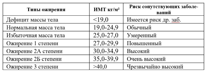 Классификация ожирения по ИМТ и риск сопутствующих заболеваний