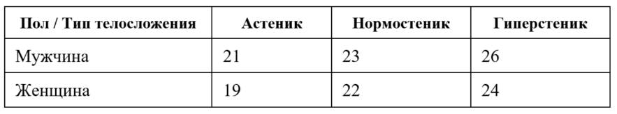 В зависимости от типа телосложения рекомендации в нашем центре по ИМТ для определения желательного веса приведены в таблице ниже.