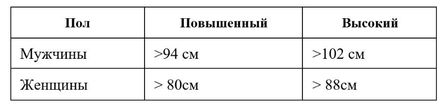 По данным ВОЗ окружность талии при абдоминальном типе ожирения определяет риск развития сопутствующих заболеваний (ССЗ, диабета и др.).