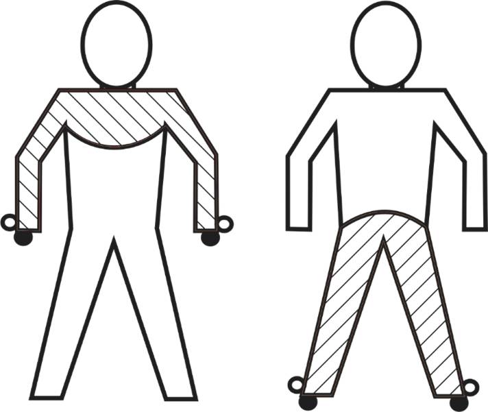 Рис. 8. Схема подключения электродов для анализа в а) ручных приборах Omron и б) совмещенных с весами приборах Tanita без выносных электродов для рук