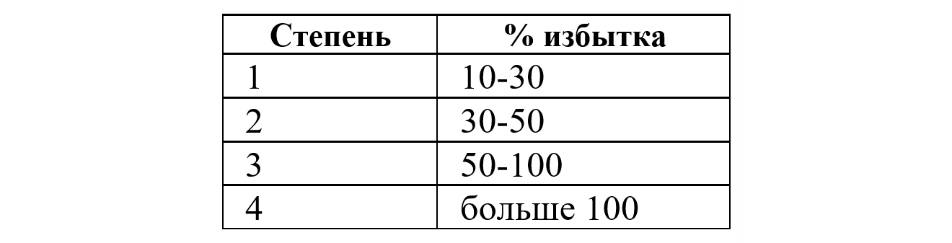 Если вес ниже табличного, то можно говорить только о возможном избыточном весе. Если вес больше табличного, тогда следует рассчитать, на сколько больше и выразить этот избыток в процентах. После этого можно установить степень ожирения. Вот формула для определения избытка веса в процентах и таблица для определения степени ожирения.