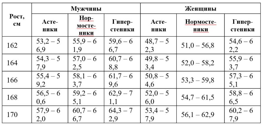 Пример. Женщине ростом 1м 66см, с нормостеничной фигурой я рекомендую массу тела: