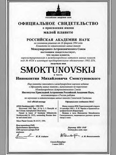 Свидетельство о присвоении имени Smoktunovskij малой планете в честь Иннокентия Михайловича Смоктуновского. 1 июля 1999 года