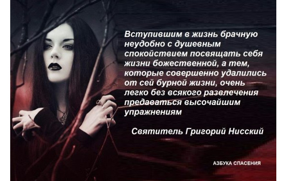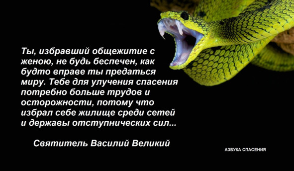 Ты, избравший общежитие с женою, не будь беспечен, как будто вправе ты предаться миру. Тебе для улучения спасения потребно больше трудов и осторожности, потому что избрал себе жилище среди сетей и державы отступнических сил… Святитель Василий Великий