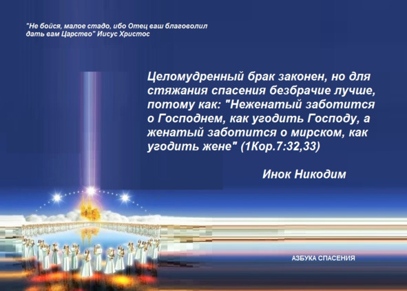 Ты, избравший общежитие с женою, не будь беспечен, как будто вправе ты предаться миру. Тебе для улучения спасения потребно больше трудов и осторожности, потому что избрал себе жилище среди сетей и державы отступнических сил, имеешь пред глазами побуждения ко грехам, и все твои чувства день и ночь напряжены к вожделению их. Посему знай, что не избежишь борьбы с отступником и не одержишь над ним победы без многих трудов на страже евангельских догматов.
