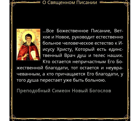 Еще не знаете, как отличить простые слова от богодухновенных (святых)? Начните читать или слушать какой-либо простой текст непрерывно, пока хватит сил и терпения, а затем любой текст из Писаний, записанный Апостолами или святыми отцами под водительством Духа Святого (Бога), и.… почувствуете разницу. От постоянного и однообразно повторяемого простого слова человеческого, душа быстро утомляется и изнемогает, а от богодухновенного Слова не устанет никогда, наоборот, успокаивается, радуется и ненасытимо вожделеет еще святого «питания», а когда прерывается, начинает испытывать голод, тоскует по Слову и ищет Его, о чем и засвидетельствовал Сам Господь: ядущии мя еще взалчут, и пиющии мя еще вжаждутся (Сирах. 24:23).