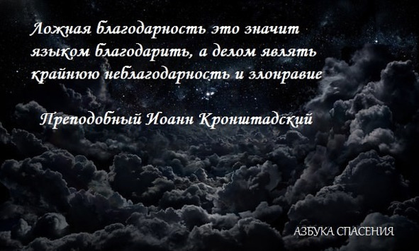 Ложная благодарность – когда, получая от Бога щедрые, незаслуженные дары духовные и вещественные, языком благодарят за них Бога и употребляют только в свою пользу, не разделяя их с ближними, получают и скрывают их в своих сокровищницах, сундуках, книгохранилищах, лишая через то многих братий своих духовного просвещения, назидания, утешения или пищи, пития, одежды, жилища, врачевства в болезни или передвижения с места на место для добывания средств к продовольствию. Такая благодарность есть ложная и богопротивная. Это значит языком благодарить, а делом являть крайнюю неблагодарность и злонравие. А как много таких благодарных, или, вернее, неблагодарных!