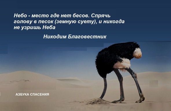 Слово небо или Небесное царство – производное от двух слов: «нет» и «бесов», следовательно, нужно понимать, что это место, где нет злых духов, как они есть на земле. Спрячь голову в песок (земную суету) и не узришь Неба – места, где нет бесов, но повсюду царствует благодать Божия. Потому как страсти – это и есть сети бесовские, которыми они пленяют наши души земной суетой и сладострастием греха, ослепляя умные очи души, не давая возможности поднять главу и воззреть Небо.