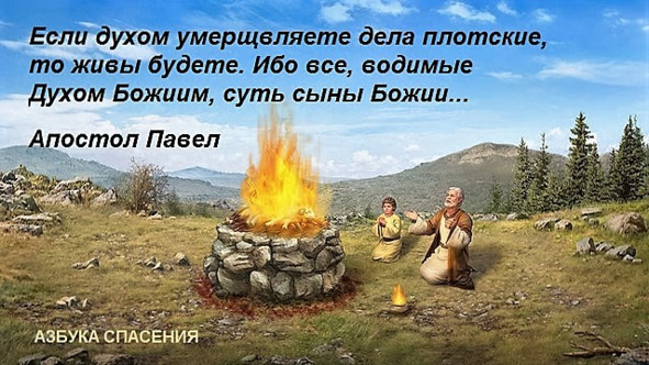 Но вы не по плоти живете, а по духу, если только Дух Божий живет в вас. Если же кто Духа Христова не имеет, тот и не Его. А если Христос в вас, то тело мертво для греха, но дух жив для праведности. Если же Дух Того, Кто воскресил из мертвых Иисуса, живет в вас, то Воскресивший Христа из мертвых оживит и ваши смертные тела Духом Своим, живущим в вас. Итак, братия, мы не должники плоти, чтобы жить по плоти, ибо если живете по плоти, то умрете, а если духом умерщвляете дела плотские, то живы будете. Ибо все, водимые Духом Божиим, суть сыны Божии. Потому что вы не приняли духа рабства, чтобы опять жить в страхе, но приняли Духа усыновления, Которым взываем: «Авва, Отче!» Сей самый Дух свидетельствует духу нашему, что мы – дети Божии. А если дети, то и наследники, наследники Божии, сонаследники же Христу, если только с Ним страдаем, чтобы с Ним и прославиться (Рим.8:1—17).