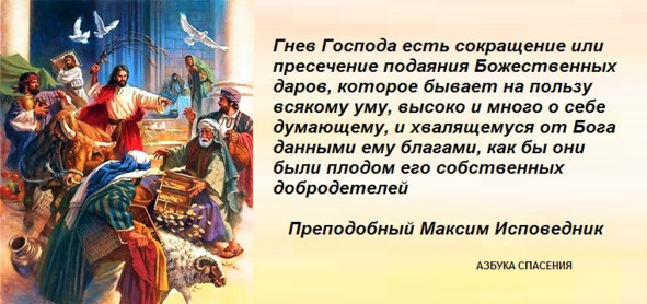 Гнев Господа есть сокращение или пресечение подаяния Божественных даров, которое (пресечение) бывает на пользу всякому уму, высоко и много о себе думающему, и хвалящемуся от Бога данными ему благами, как бы они были плодом его собственных добродетелей. Преподобный Максим Исповедник