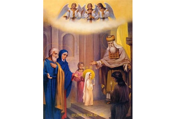 Когда наступила полнота времени и приближалось время избавления рода человеческого чрез Божественное вочеловечение, долженствовало, чтобы нашлась такая чистая, непорочная и святая дева, которая бы достойна была воплотить бесплотного Бога и послужить делу нашего спасения. И такая дева нашлась: дева – чистейшая всякой чистоты, пренепорочнейшая несравненно более всякого разумного создания, святейшая всякой святыни, пречистая и преблагословенная Дева Мария, отрасль святых, праведных Богоотцев Иоакима и Анны, плод родительских молитв и пощений, дочь от рода царского и архиерейского. Нашлась на месте святом, в церкви Соломоновой, Она – долженствовавшая Сама быть одушевленною церковью Божией. Внутри храма, в святилище, именовавшемся «Святая Святых», нашлась Та, Которая имела родить всех святых святейшее слово (Из цер. служб). Там, с высоты славы царствия Своего, призрел Господь на смирение рабы Своей и избрал Ее, предизбранную из всех родов, в Матерь Своему Предвечному Слову.